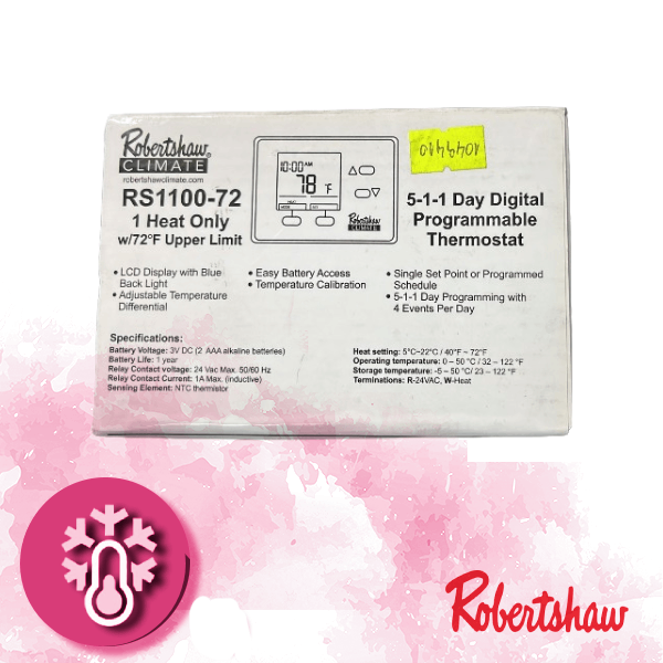 - El termostato programable de 5-1-1 días de la serie económica RS1100-72 de Robertshaw® es un impresionante termostato de bajo costo. Con una hermosa luz de fondo azul vibrante, la serie RS1100 es la opción correcta para un termostato programable económico para aplicaciones residenciales nuevas y de reemplazo. Pueden configurarse para controlar equipos convencionales de HVAC a gas o eléctricos, bombas de calor, aceite y milivoltios. Este es un termostato de calor simple de 2 cables. Puede configurarse para Fahrenheit o Celsius, y puede usarse como operación manual o programable de 5-1-1 días.