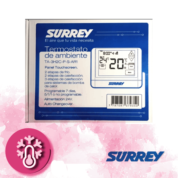El termostato Surrey TA-3H2C-P-S-AR1 es un controlador digital programable táctil (touchscreen) de 24V diseñado para sistemas complejos de climatización. Ofrece alta versatilidad al controlar hasta 3 etapas de calor y 2 de frío (3H/2C) en bombas de calor, o 2 etapas de calor/frío en sistemas de gas.