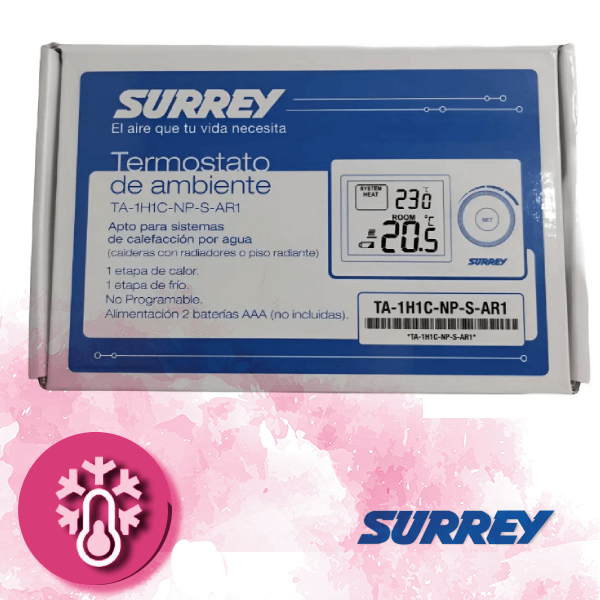 - El termostato Surrey TA-1H1C-NP-S-AR1 (o similar TA-2H1C-NP-S-AR1/2H1C-NP-C-AR1) es un dispositivo digital no programable diseñado para controlar sistemas de frío-calor, incluyendo bombas de calor. Ofrece precisión de , pantalla retroiluminada y alimentación dual de 24V o baterías AAA.